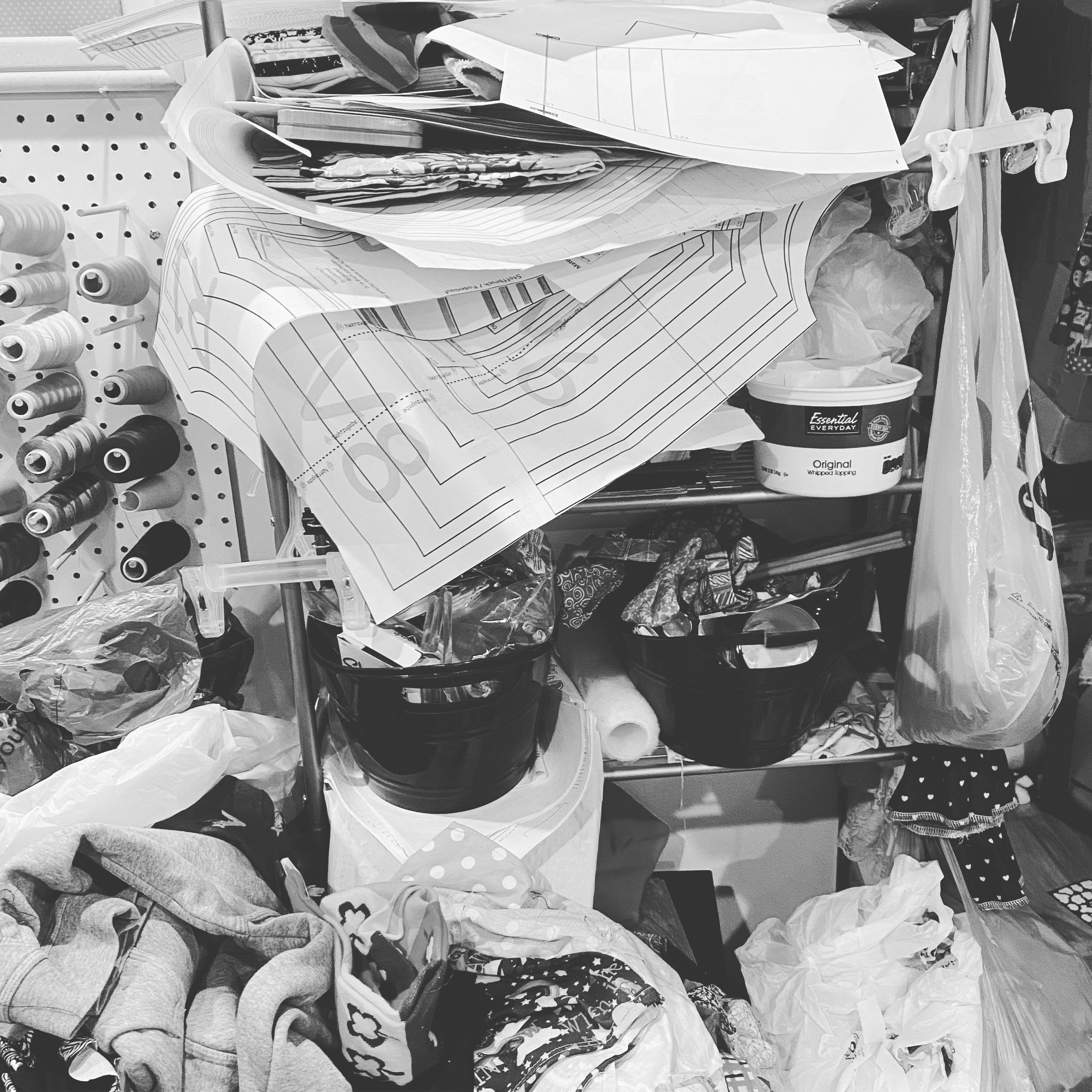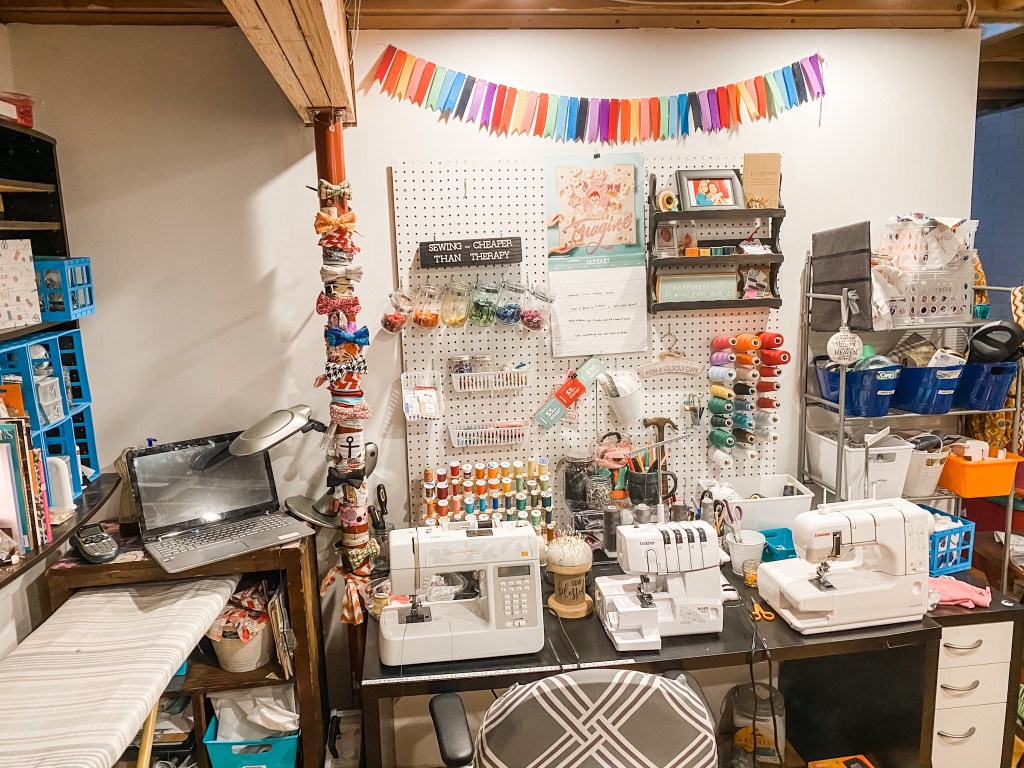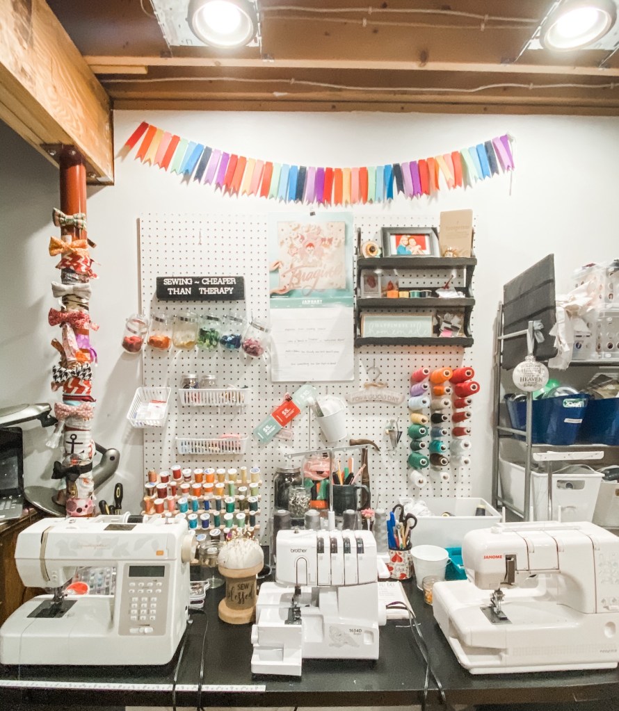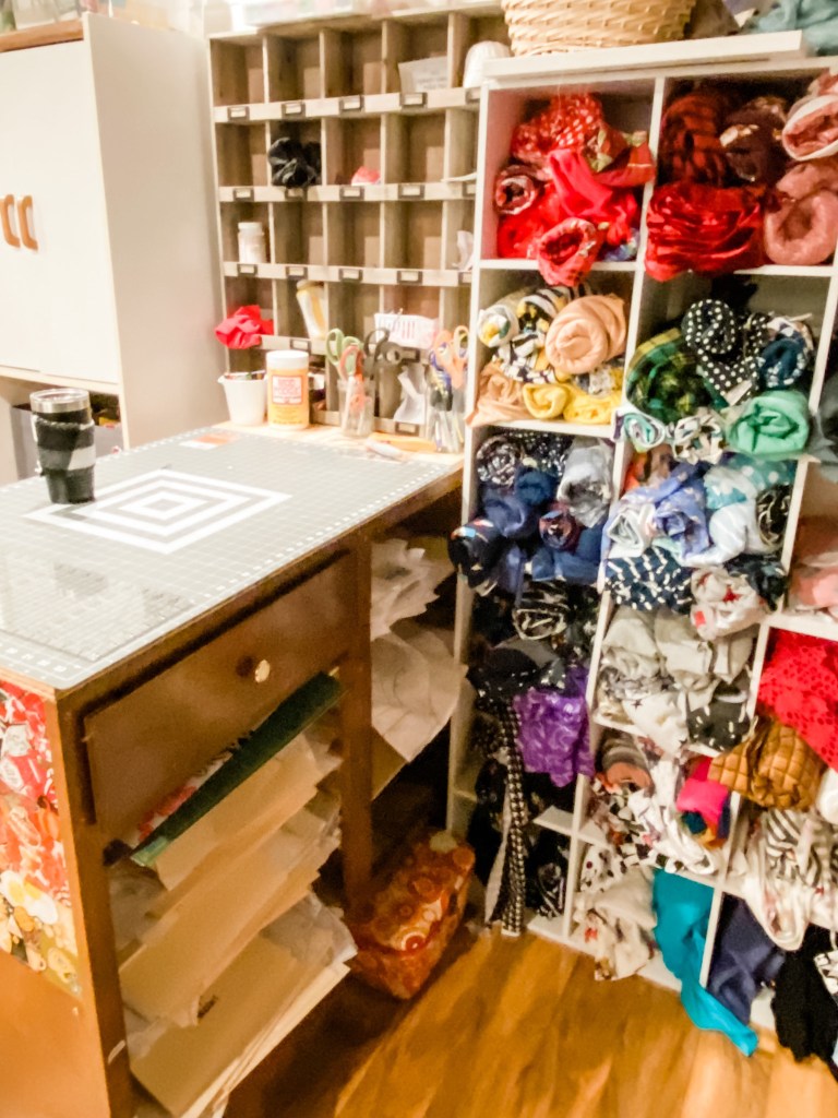 I haven’t shown the full studio, because I have scrap fabric coming OUT OF MY EARS! I save everything! It’s a blessing and a curse….so hopefully I will get a lot of that used up in the month of January. 🙂 But, apart from that, this is a HUGE LEAP in the right direction for me. I’m not a “clean” and “organized” person by nature….so I will TOOT all the HORNS and be proud of myself this week.