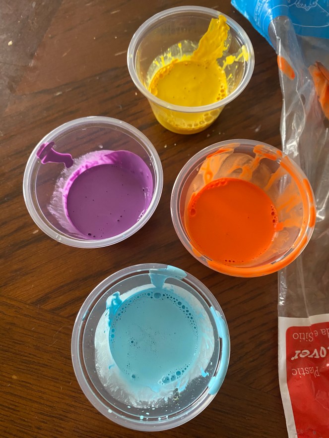 Then I used a very little amount of paint, we’ll call it “a Squirt” with a tsp or less of water and “a drop” of dish soap for each color. Super technical measurements. If the mixture is TOO runny, you’ll know…because it will drip. So use less water than you think at first.